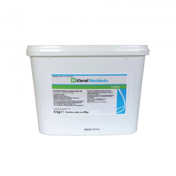 To Klerat Waxblocks διατίθεται σε μπλε κέρινους κύβους 20g με τρύπα, για εύκολη χρήση στους δολωματικούς σταθμούς.