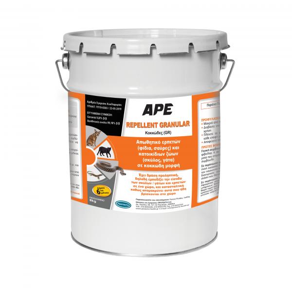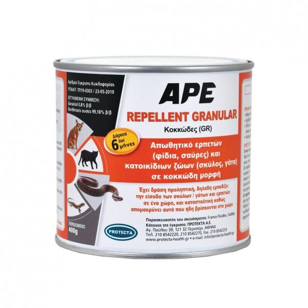 Το APE REPELLENT GRANULAR είναι απωθητικό ερπετών (φίδια, σαύρες) και κατοικίδιων ζώων (σκύλος, γάτα) σε κοκκώδη μορφή. Έχει δράση προληπτική, δηλαδή εμποδίζει την είσοδό τους σε ένα χώρο, καθώς και κατασταλτική γιατί απομακρύνει αυτά που ήδη βρίσκονται στο χώρο.