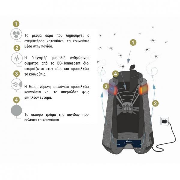 Η μέθοδος σύλληψης της παγίδας βασίζεται στη μίμηση της μυρωδιάς του ανθρώπινου σώματος. Το BG-Sweetscent είναι ένα ειδικά σχεδιασμένο προσελκυστικό, διεθνώς κατοχυρωμένο, το οποίο είναι ιδιαίτερα ελκυστικό για τα κουνούπια.